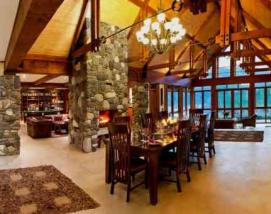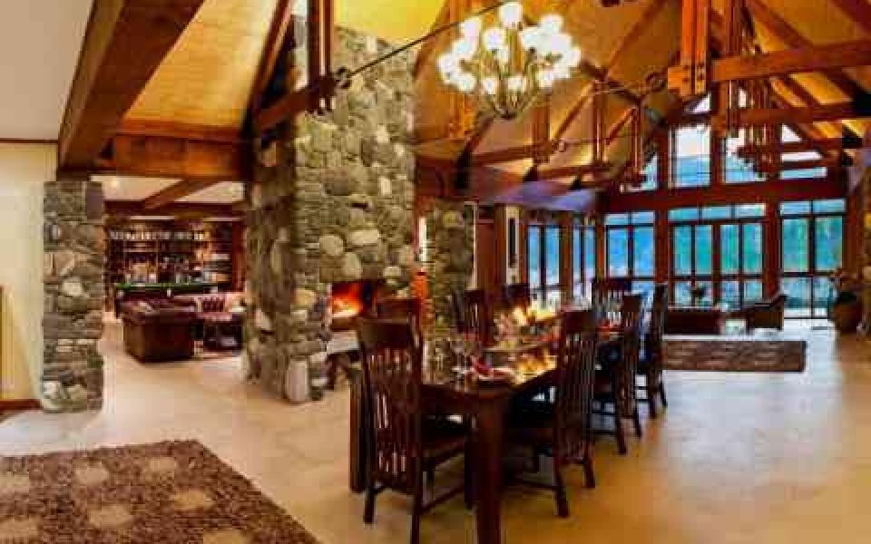 Architecturally designed and built from local stone and timber, the Lodge offers a warm earthy atmosphere. The interior focuses on the large stone double sided fireplace which provides the ambiance to the games room, dining room and sunroom. A large open kitchen adjoining the dining area offers the relaxed atmosphere where guest dine together. Private dining can also be catered for. Complete with library, a snooker table, and the "Matai Bar", guests will have the ideal setting to relax after an exciting days fly fishing or exploring the numerous sites and attractions of the local region.